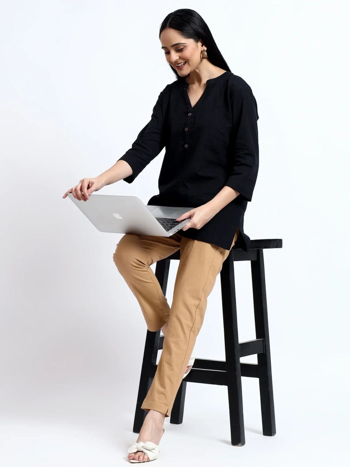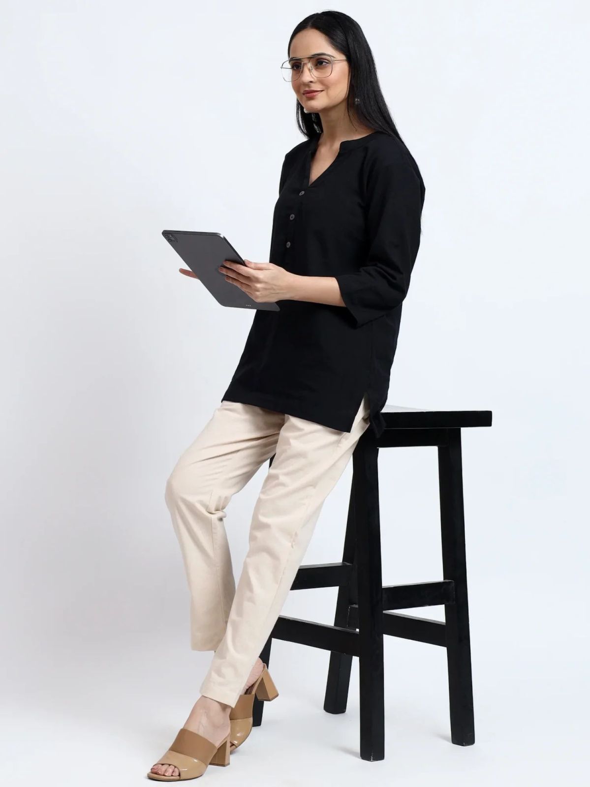 We offer a sophisticated Black Beige Linen Cotton Short Kurta Pant Set suitable for formal occasions. Crafted from high-quality linen material, this Kurta Pant Set comes in a range of sizes from S to 4XL with a regular fit. The 3/4th sleeves and Mandarin collar add a touch of elegance, while the 3 wooden buttons provide a stylish detail. The pant fabric is 100% cotton for comfort. Perfect for exporters, suppliers, and traders looking to provide their customers with a versatile and classy ensemble.