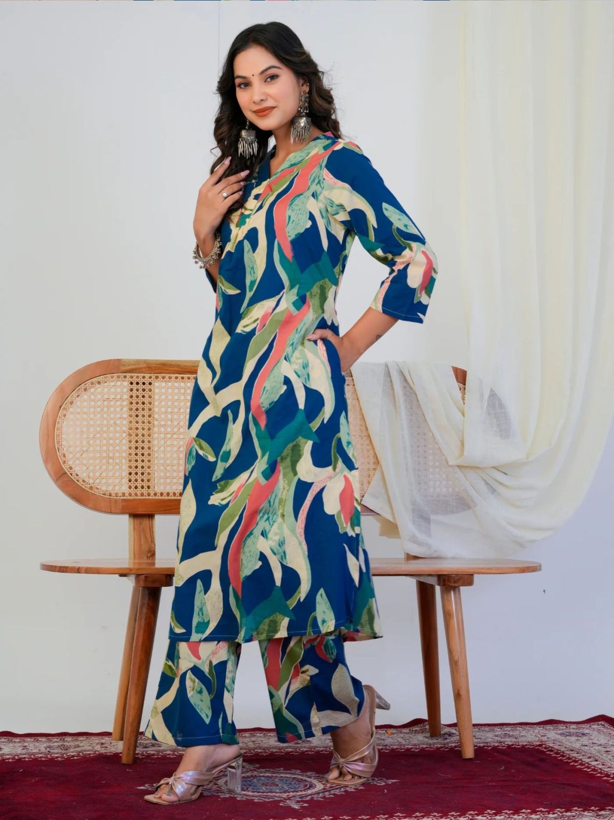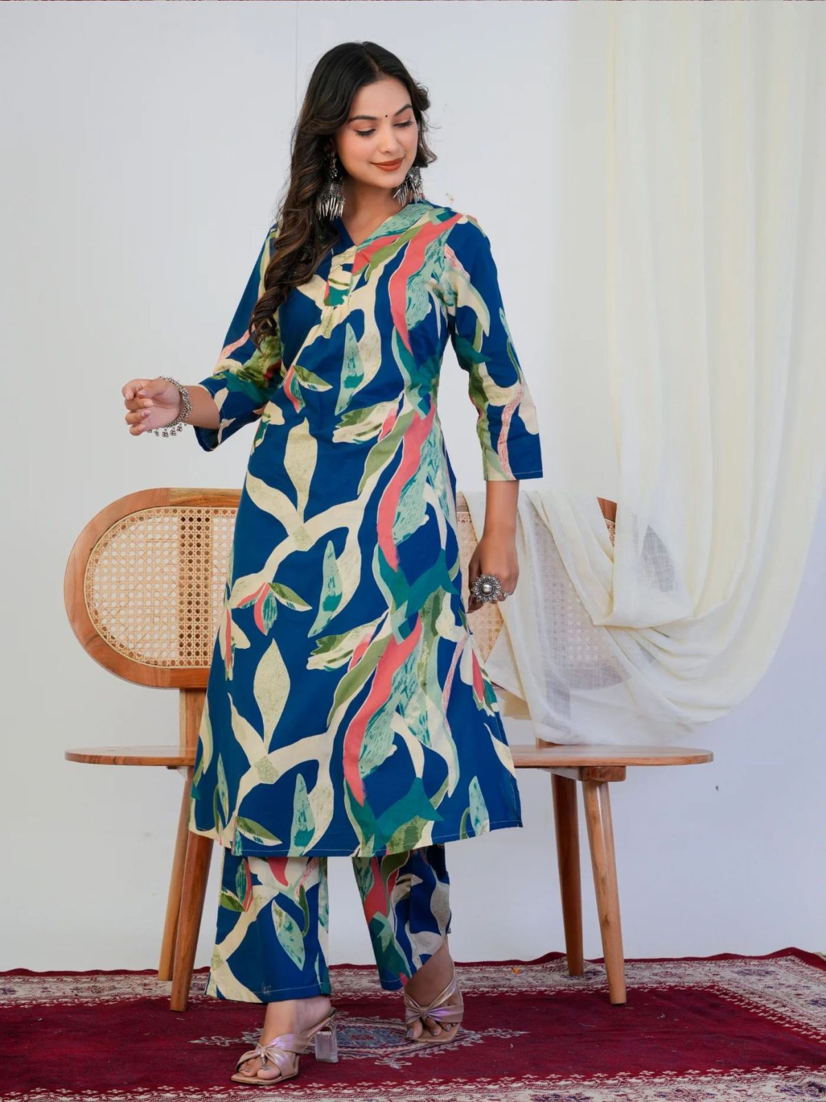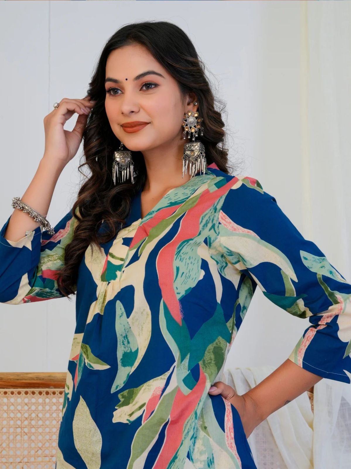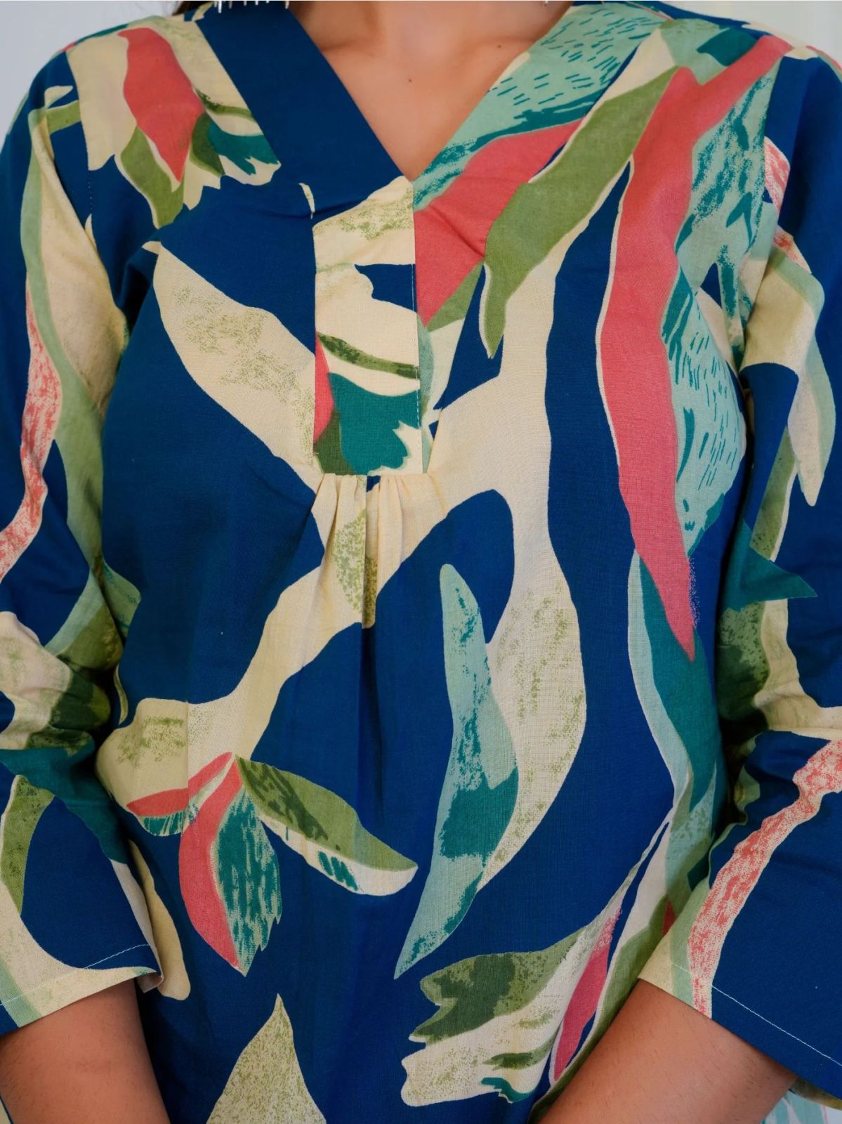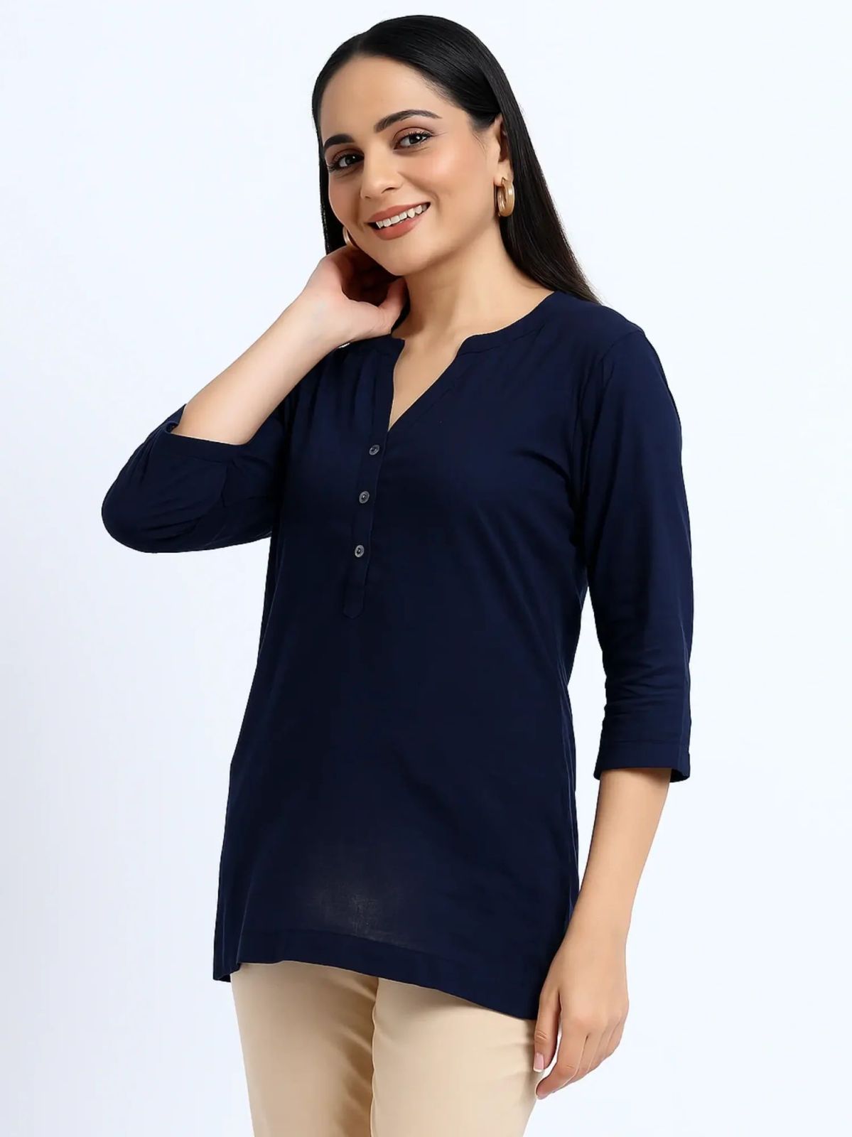 We offer a Navy Blue Beige Linen Cotton Short Kurta Pant Set in sizes ranging from S to 4XL. This set features an airy linen short kurta with cotton pant, designed for a regular fit. The kurta has 3/4th sleeves, a mandarin collar with 3 wooden buttons, and is made of 20% linen and 80% cotton. The cotton pant has a mid-rise and is 100% cotton. Perfect for formal occasions, this set is ideal for exporters, suppliers, and traders looking for high-quality and comfortable attire.