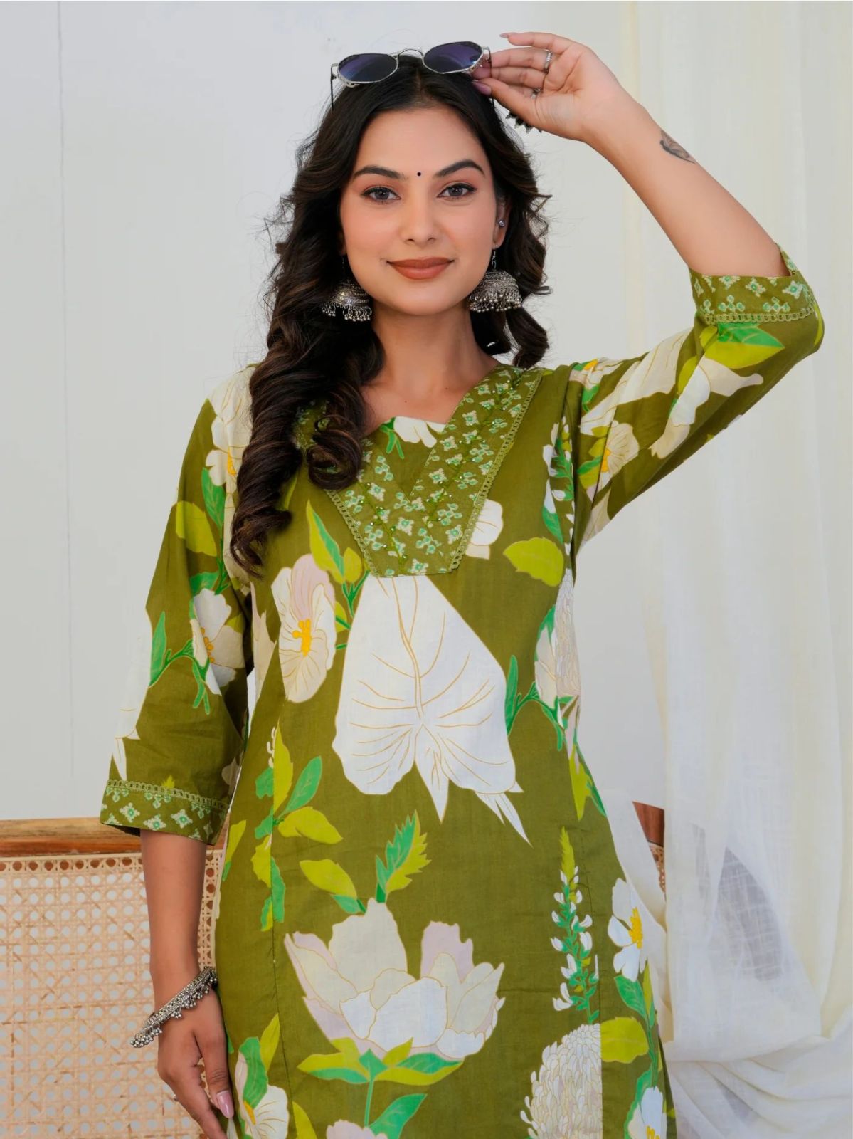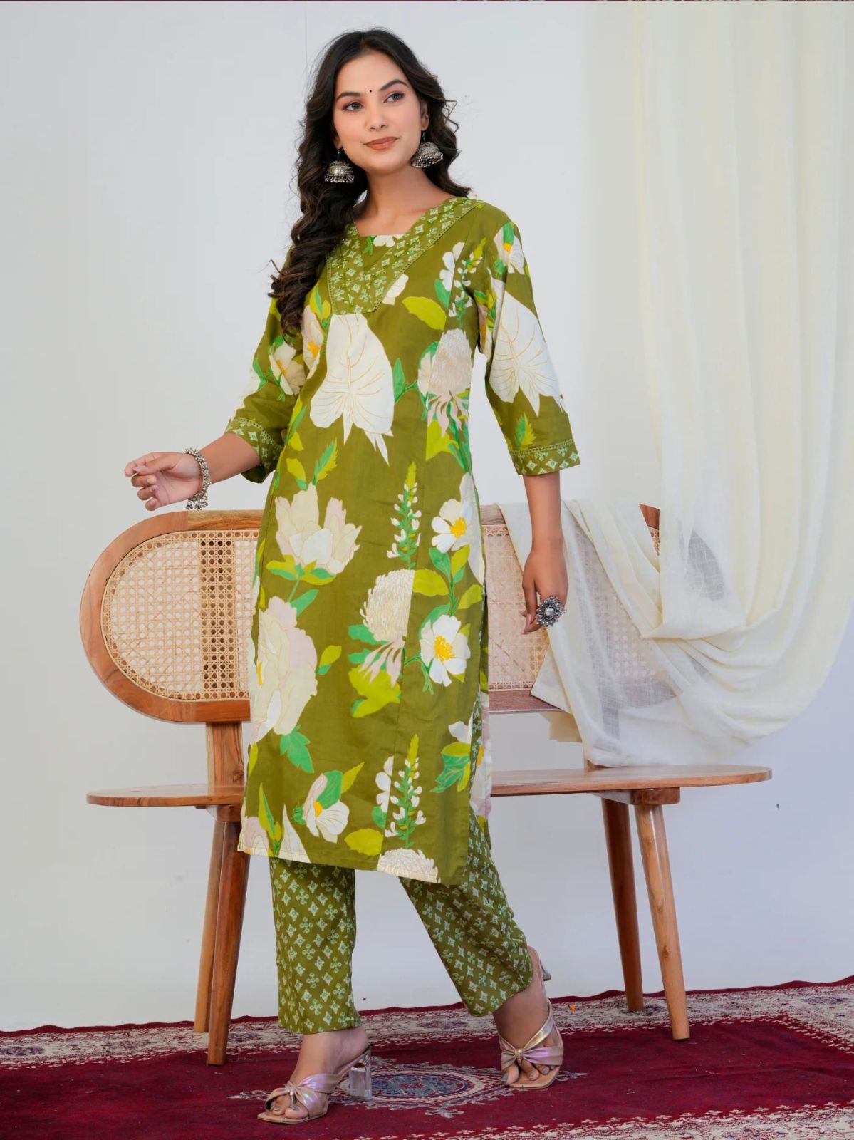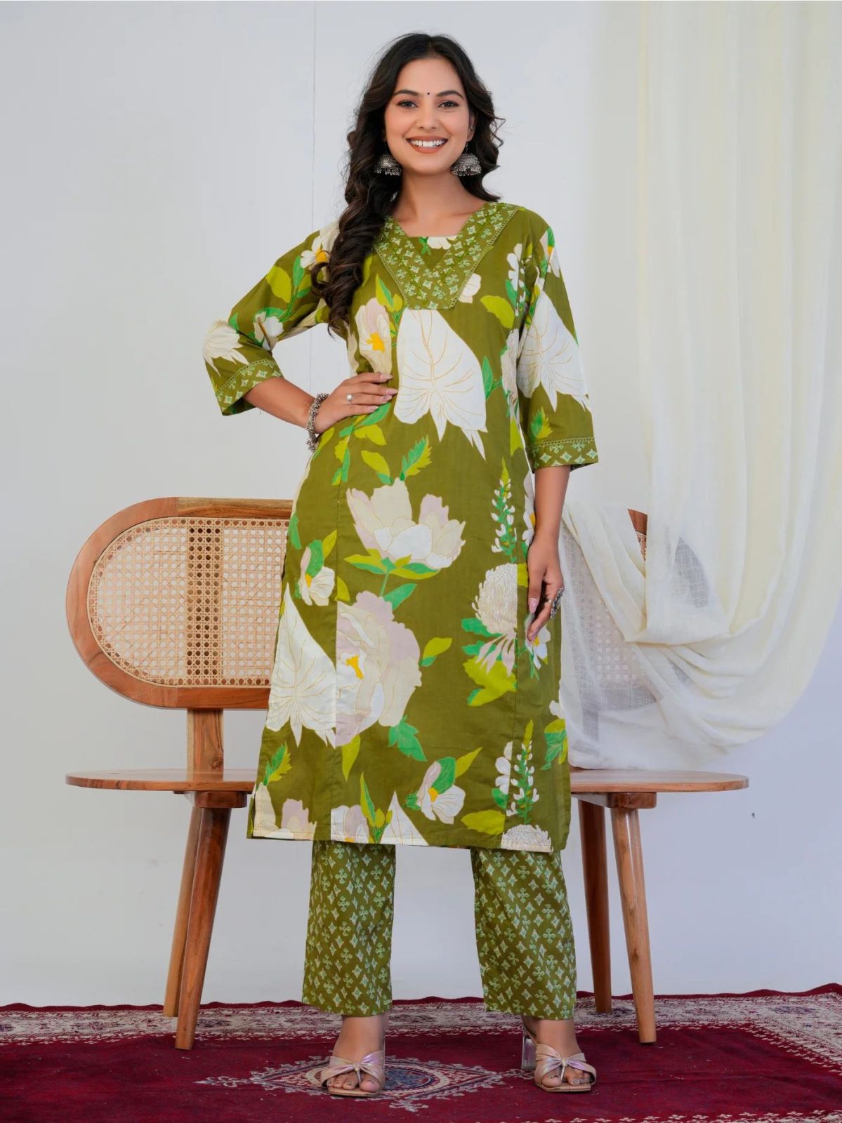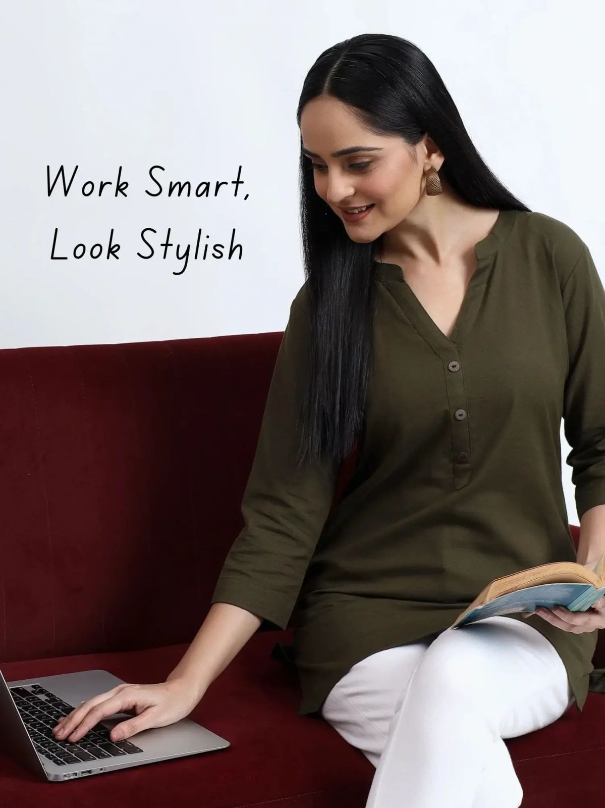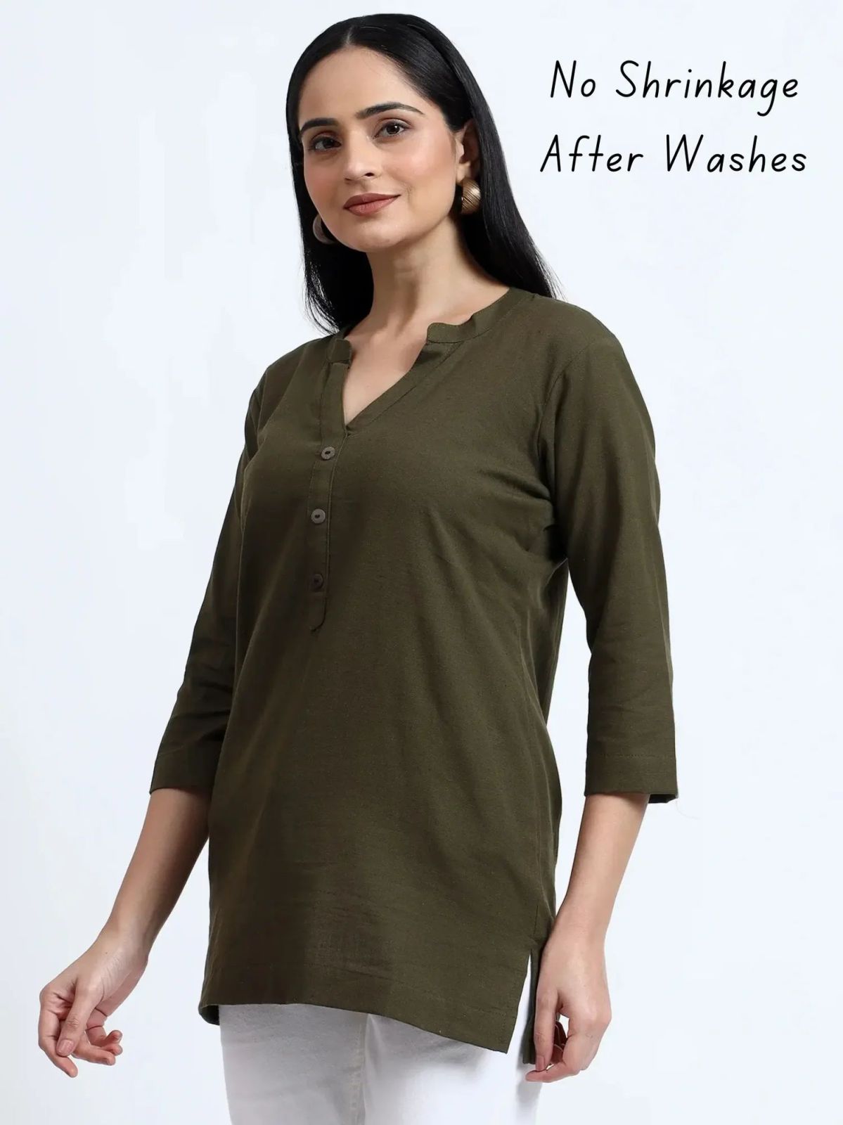 We offer an Olive Green White Linen Cotton Short Kurta Pant Set in sizes ranging from S to 4XL. This set features an airy linen short kurta with cotton pant, designed for a regular fit. The kurta has 3/4th sleeves, a mandarin collar with 3 wooden buttons, and is made of 20% linen and 80% cotton. The cotton pant is mid-rise and made of 100% cotton. Perfect for formal occasions, this set is ideal for exporters, suppliers, and traders looking for high-quality and comfortable attire.