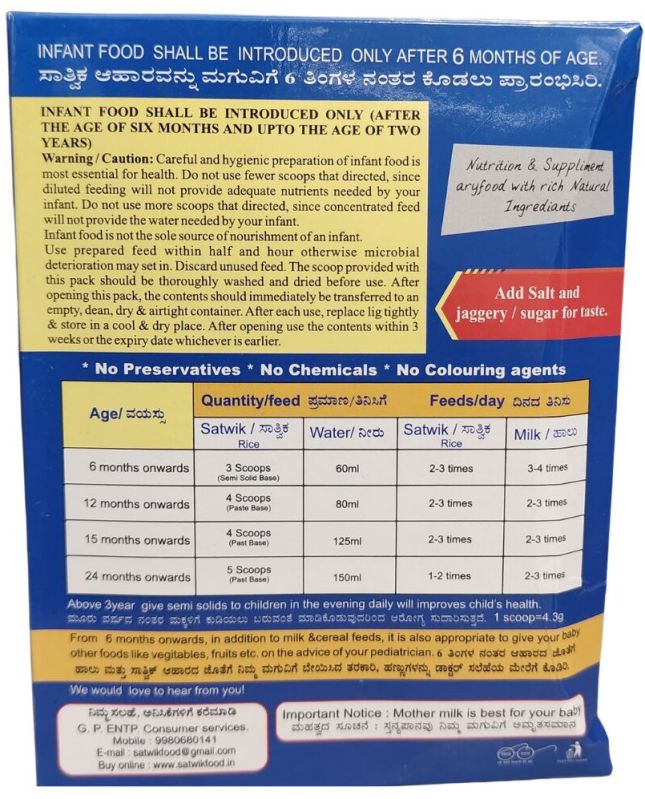 We are a leading Manufacturer, Exporter, and Supplier of Satwik Sugar Free Rice Cereal, originating from India. Our easy-to-digest infant food is CBRI Approved and boasts a shelf life of 1 year. With a blend of cereals, our sugar-free formula ensures a healthy start for your little ones. Each pack contains a generous number of flowers, making it a nutritious choice for growing babies. Trust us for high-quality, safe, and delicious baby food that meets all your dietary requirements.