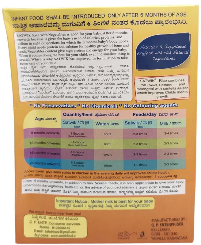 How To Prepare : Wash your hands before prepairing baby's feed. Use only clean utensils. Pour necessary quantity of satwik & mix required quantity of milk. Stire till it becomes thick paste. Boil the mixture for few seconds until the pap is smooth. Feed your baby with a clean spoon. Use prepared 4 feed with in half an hours.