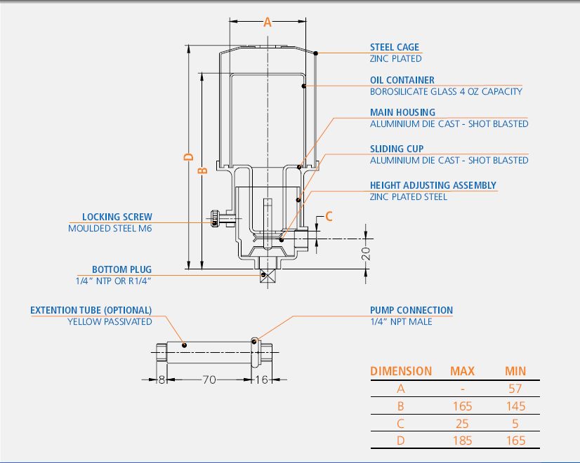 Constant level Oiler is used to maintain a particular oil level in a Pumps for better lubrication. By the lubricator, the depleted oil is automatically replenished. If the oil level falls below this point, it returns to its original level. Our oilers lower the maintenance costs and increase the efficiency. This Oiler has detachable oil container with adjustable oil level. It’s Oil container and pump attachment fitting parts are Aluminum die cast for reduce the brakeage.