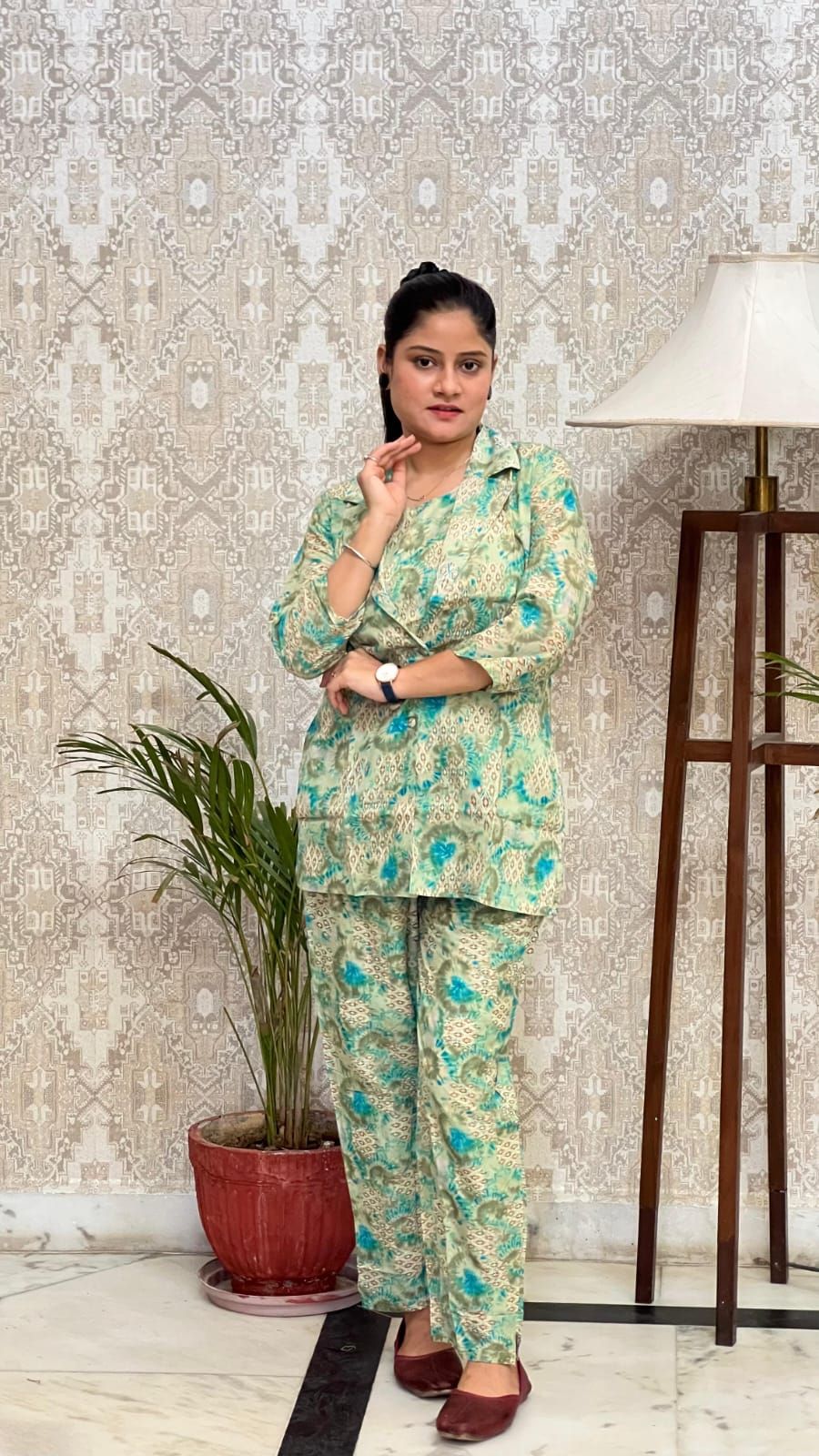 We offer a stylish Ladies Green Aqua Maze Co-ord Set crafted from a soft cotton blend, featuring a unique geometric bloom pattern with turquoise trails. The set comes in a refreshing green base with aqua accents, designed with a round neck and button placket for a casual and indoor wear. The mid-calf kurta has full-length sleeves, while the straight pants boast a matching print and side pockets. Embrace the structured fit and elevate your style with this chic ensemble. Perfect for suppliers and traders looking to offer trendy and comfortable clothing options to their customers.