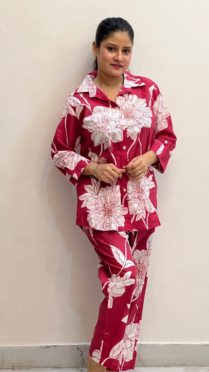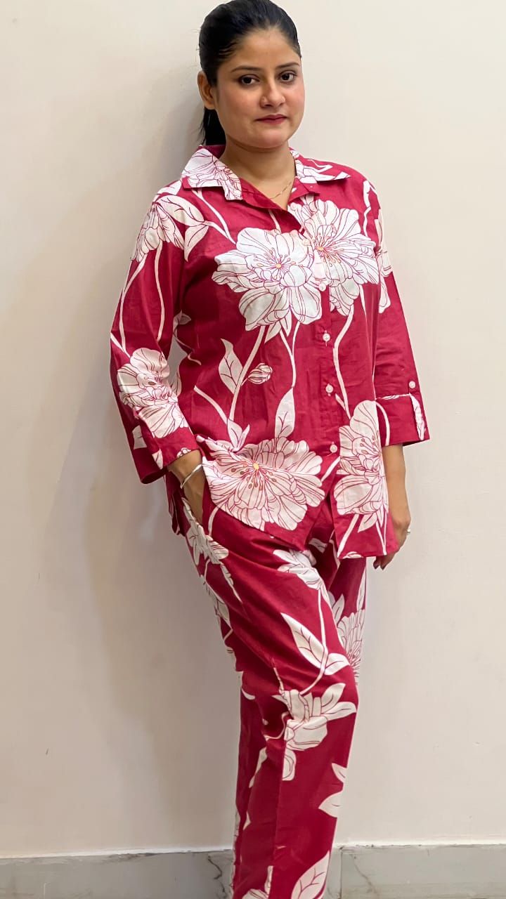 We offer a stylish Ladies Red Scarlet Stem Co-ord Set crafted from a soft cotton blend. This set features an oversized stem floral pattern with petal detailing in red base with white accents. The buttoned round neck and full-length sleeves add a touch of elegance, perfect for casual and daywear occasions. The mid-calf kurta and straight pants with matching print create a relaxed fit silhouette with pocket detailing. Ideal for those seeking a fashionable yet comfortable ensemble. Supplier and trader of quality women's fashion.