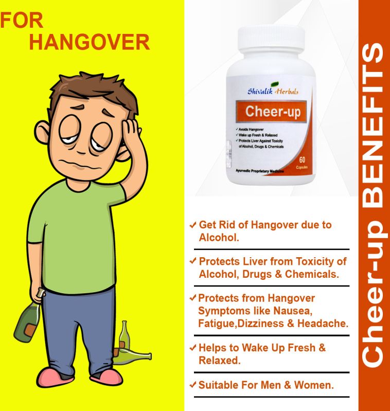 Cheer up is a unique herbal product for hangover & liver damage due to alcohol & drugs. The special herbal capsule helps detoxify your body by counteracting the effect of alcohol to help you feel good. It protects you against irritating hangover symptoms such as dry mouth, nausea, fatigue, dizziness & headache.