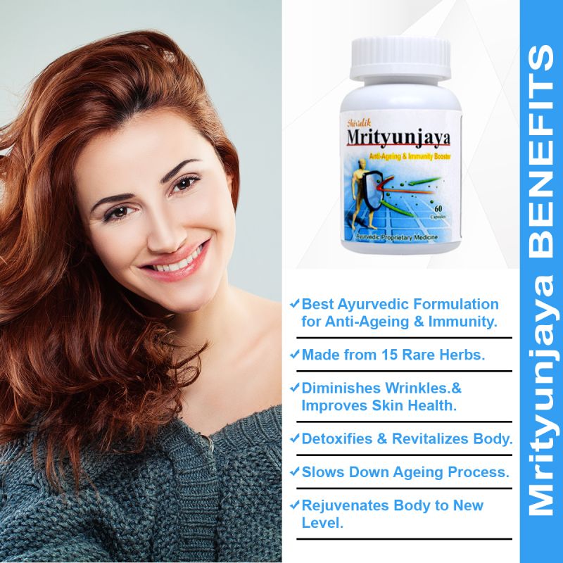 with the advancement of age, the body deteriorates and there is increase in body fat, decreased bone density, decreased libido, wrinkles, decreased energy & weakened immune system. Though some changes due to ageing are inevitable, but others can be controlled. Mrityunjaya is the combination of 15 herbal and natural extracts that detoxify and revitalize the body cells and boost immunity. It mitigates or slows down the ageing process.