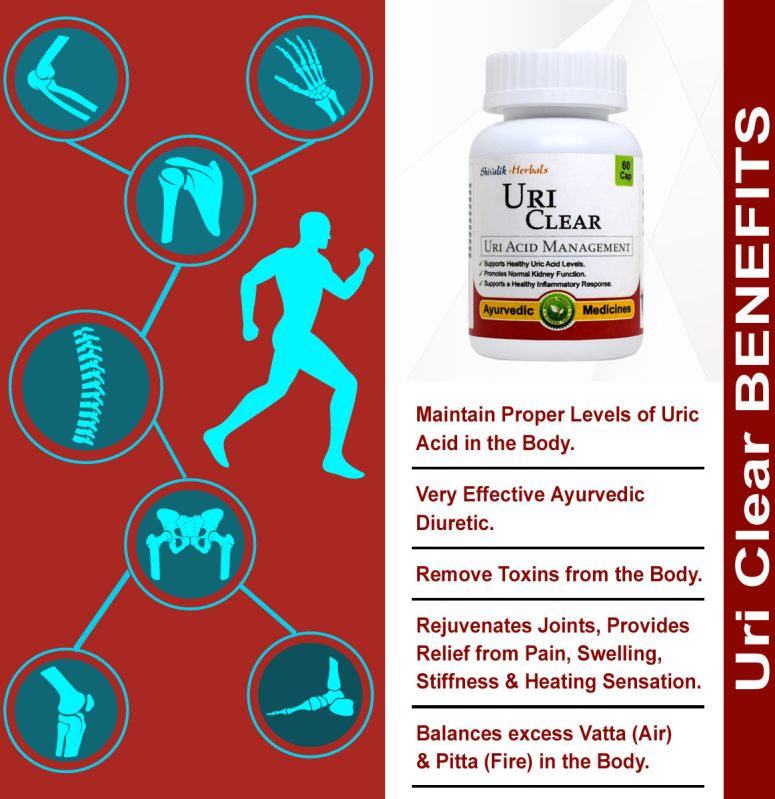 Uri clear is an Ayurvedic formulation which helps to maintain proper levels of Uric Acid in the body. It helps to remove toxins from the body thus maintain proper level of uric acid. It rejuvenates joints provides relief from pain, swelling, stiffness and heating sensation of joints and it also balances the excess Vatta (Air) & Pitta (Fire) in the body.