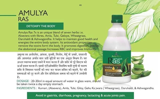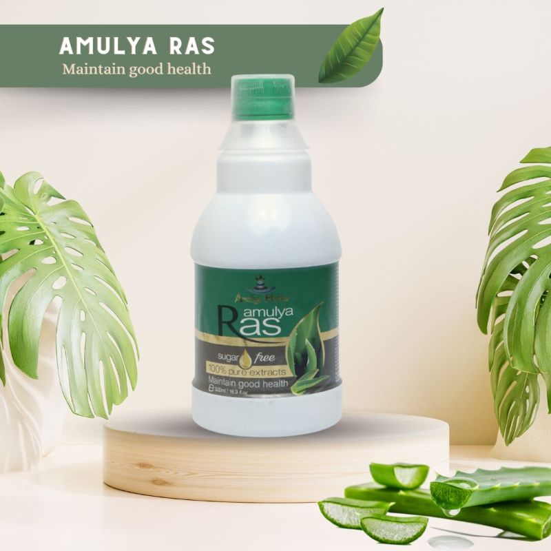 Amulya Herbs AMULYA RAS. Amulya Ras 7x is an unique blend of seven herbs i.e. Aloevera with fibres, Amla, Tulsi, Geloye, Wheatgrass, Daruhaldi & Ashwagandha. It helps to maintain good health and energies the entire body system. Its antioxidant properties remove the toxins form the body. It promotes digestion, purifies the abdominal passage Increases RBC and improves Immunity.