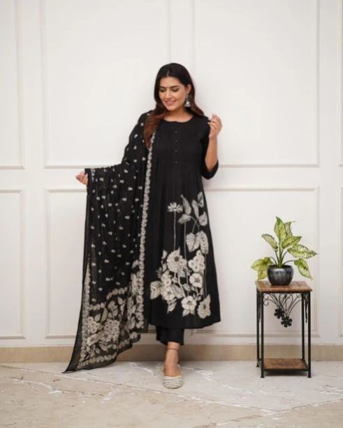 Beautiful pure cotton A line suit set💗 Kurti fabric= cotton Pant fabric= cotton Dupatta fabric= mulmul *Work= embroidery work*🪡 Kurti length = 46+ inches Pant length = 38 inches Dupatta length =2.10 miter