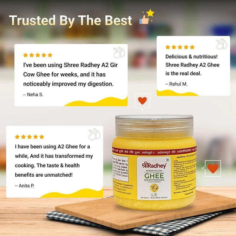 Shree Radhey Ghee is made from Indian Native Gir cows milk. The product is free from artificial colours, preservatives, flavours, sweeteners, and chemicals. Our premium A2 milk ghee helps to boost digestive strength by stimulating the secretion of digestive enzymes inside the body. Our organic A2 cow Ghee contains monounsaturated Omega-3s, fat-soluble vitamins A, D, E, and K, and a fatty acid linked to an immune system response for inflammation management.