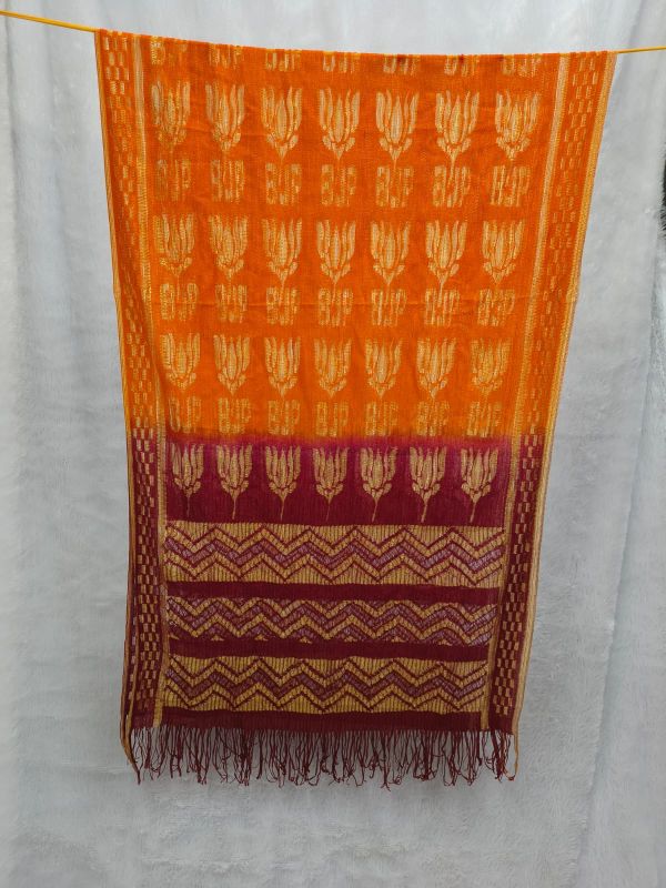 BJP Dupatta. used for rally and elections and chunav prachar. Bhgwa color body with Maroon color borders. designed with lotus flower and BJP. Election Material and Chunav Prachar Samagri.