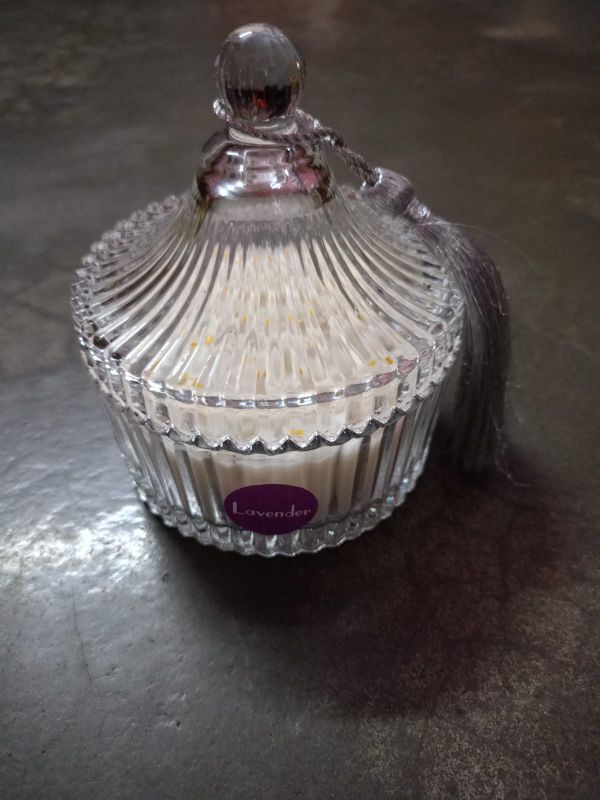 Scented Big Ribbed Jar Candle.Material used is Soy wax, colour-Clear, , Approx wt-400-450gms.Burning time 24-26hrs approx