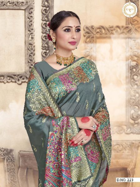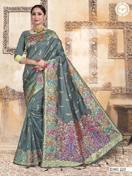 Adorn yourself with Kahsmiri Silk Sarees. Kashmiri Silk Saree has a wide range of verities in silk textile designs and it’s a known fact that the Mulberry cocoon reared in the state of Jammu and Kashmir is the superior quality in the Asia. Intricate antique multi colored zari detais pallu ornamented with Mango Multicolored zari the highlight of this saree.