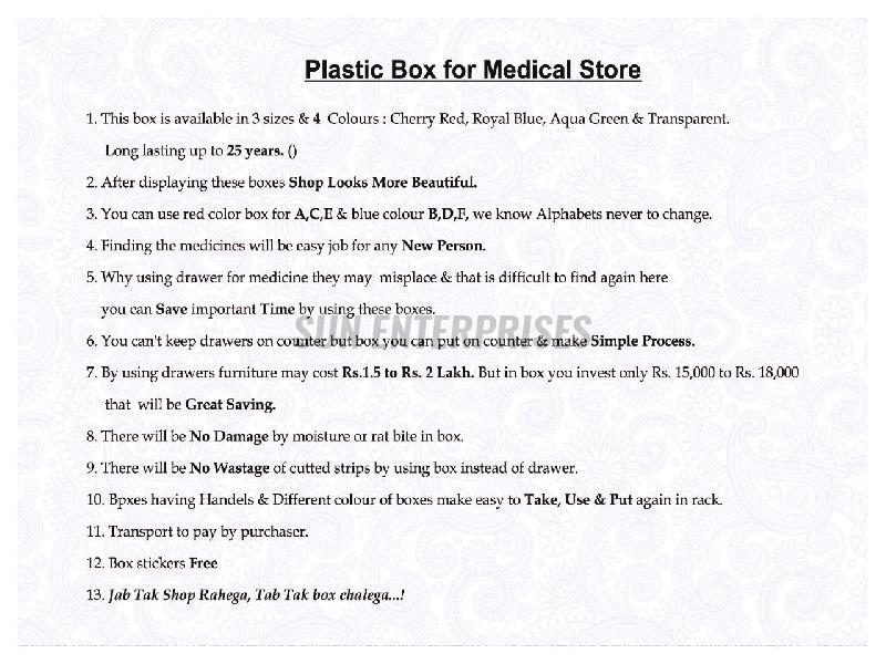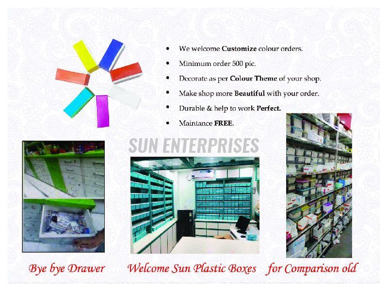 These plastic boxes are use for storingMedicines in medical shops. Four colours and four sizeswill make your shopseasy to manageand make your shops lookbeautiful.