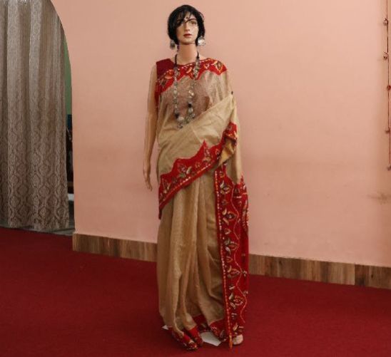 Tussar colour cotton Kota same with red border and pallu enriched by multiple coloured kantha work, 6.5m in length with 1m blouse piece.