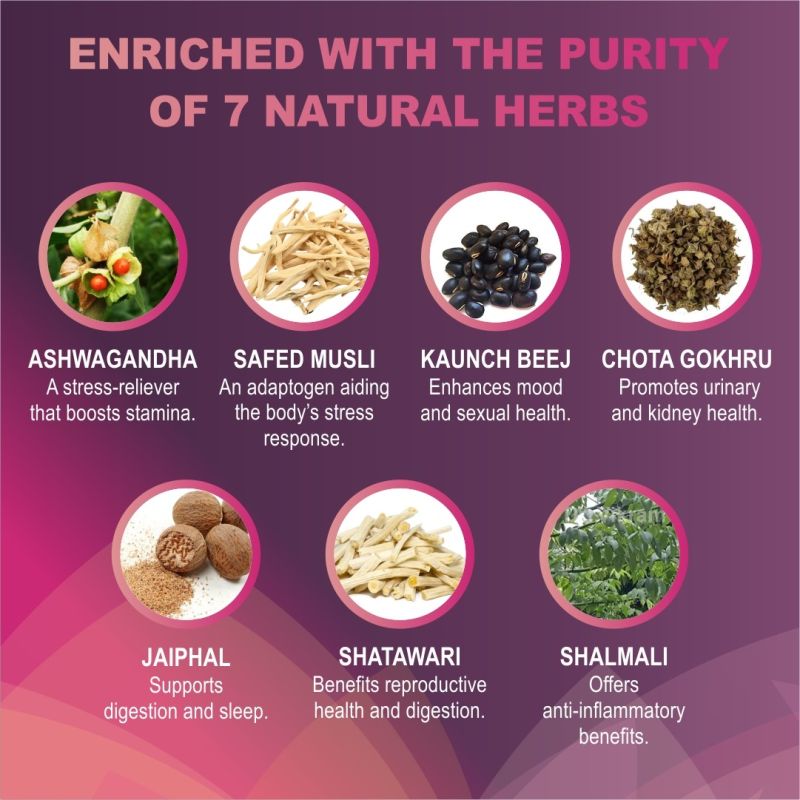 • Kaunch Beej Extract : Enhances mood and sexual health.
