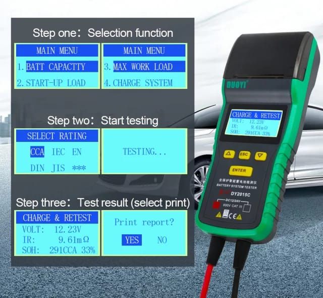 Standard of optional storage battery:CCA: 100-1700; IEC: 100-1000; EN:100-1700;DIN:100-1000; JIS: need to compare CCA with a table(the table is included in user manual). Generally, battery standard was marked on battery body. In case there is no mark, please refer to vehicle exhaust, more details in "quick start guide"