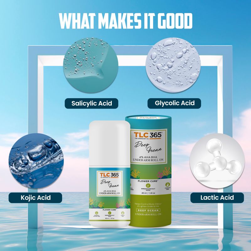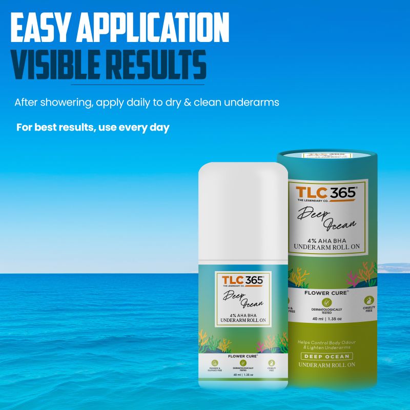 TLC365 Deep Ocean Underarm Roll On combines antiperspirant action with brightening ingredients for fresh, even-toned skin. With the exfoliating power of 4% AHA BHA, its skin-friendly formula tackles sweat, pigmentation and discoloration, leaving your underarms bright and odour-free.