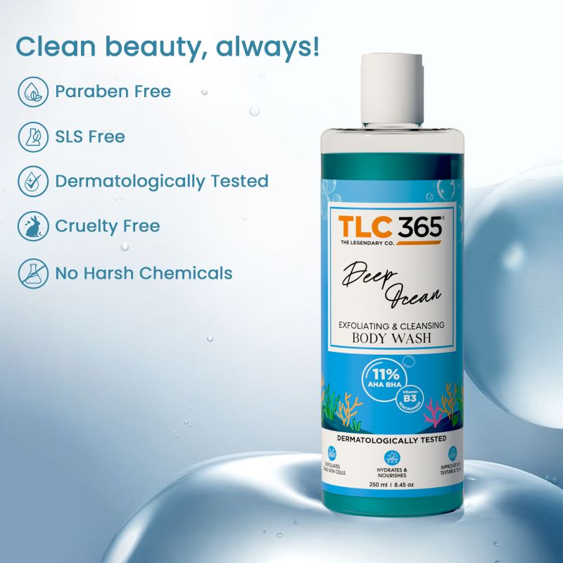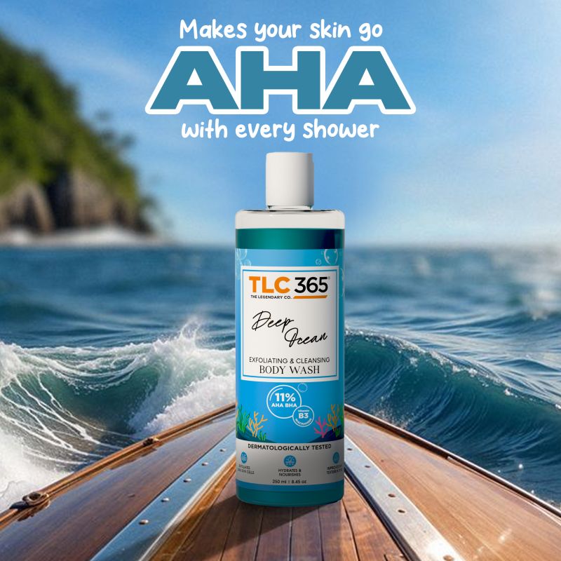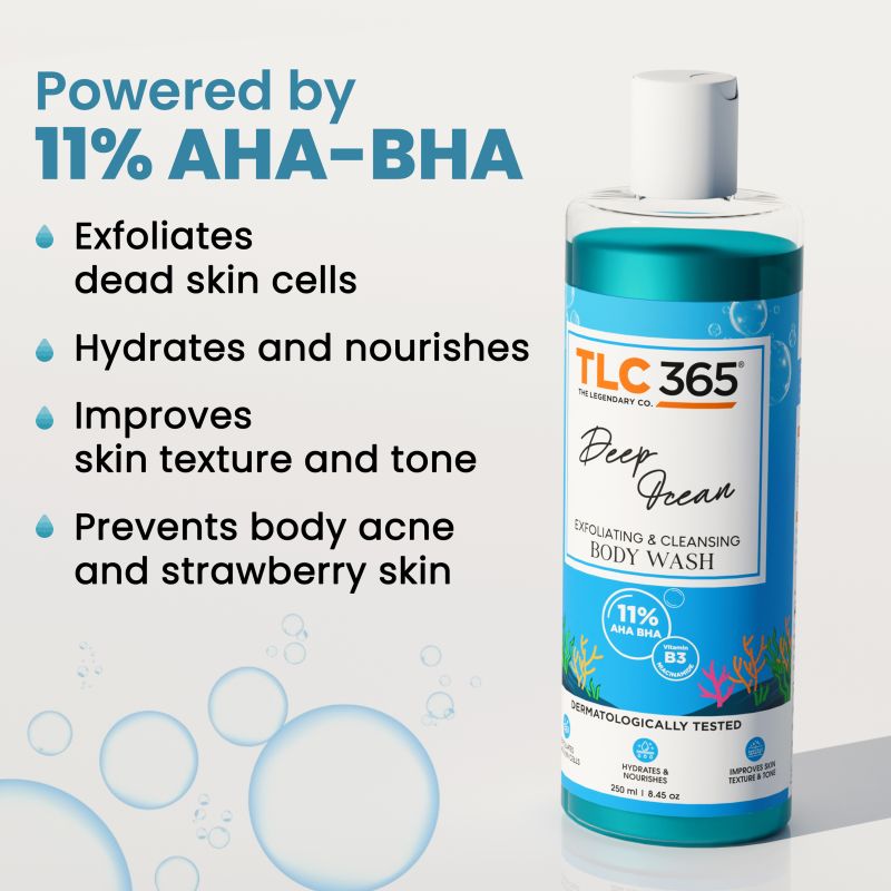 TLC365 Deep Ocean Exfoliating & Cleansing Body Wash is formulated with 10% AHA & 1% BHA (Lactic Acid, Glycolic Acid and Salicylic Acid) that gently removes dead skin cells and unclogs pores to reveal visibly smoother, fresher skin.