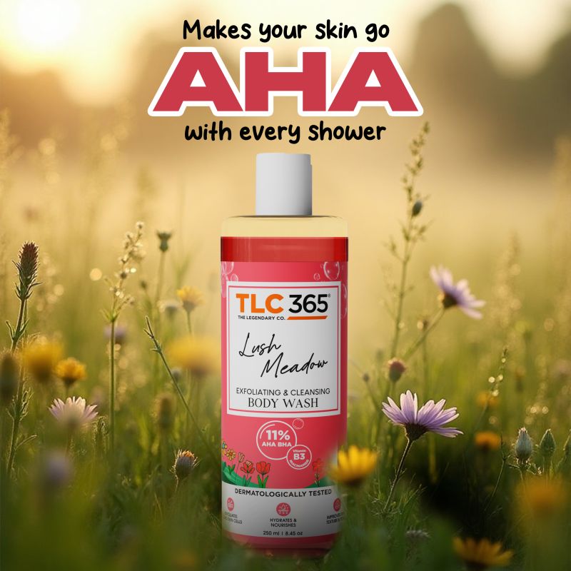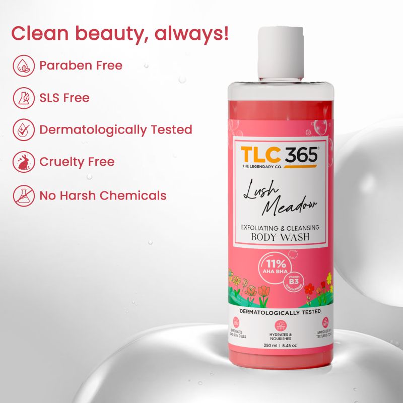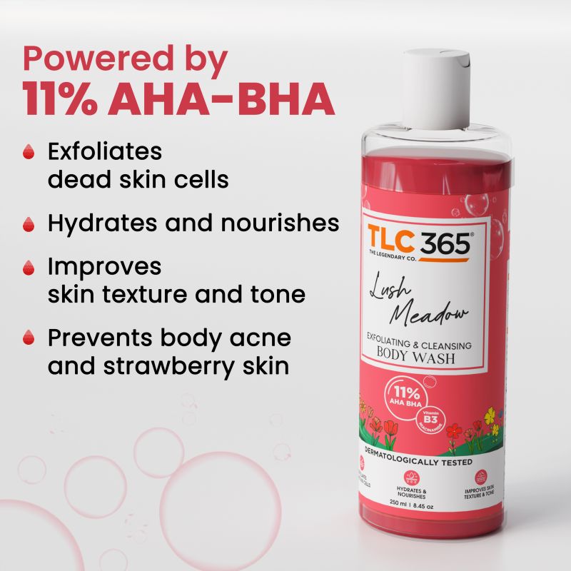 TLC365 Lush Meadow Exfoliating & Cleansing Body Wash is formulated with 10% AHA & 1% BHA (Lactic Acid, Glycolic Acid and Salicylic Acid) that gently removes dead skin cells and unclogs pores to reveal visibly smoother, fresher skin.