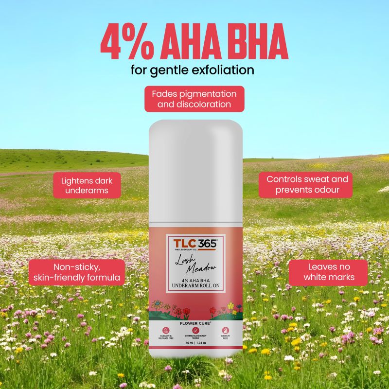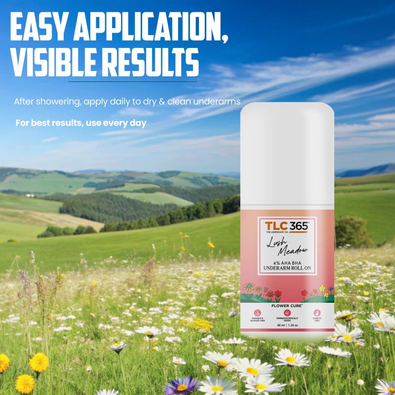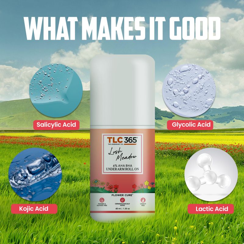 TLC365 Lush Meadow Underarm Roll On combines sweat protection with skin-brightening ingredients for fresh, even-toned underarms all day long.Powered by 4% AHA BHA, including Glycolic Acid, Lactic Acid, Salicylic Acid and Kojic Acid, it gently exfoliates to reduce pigmentation and prevent discoloration.