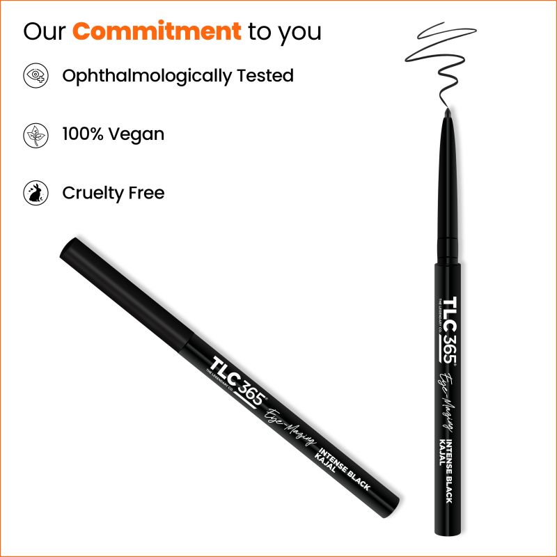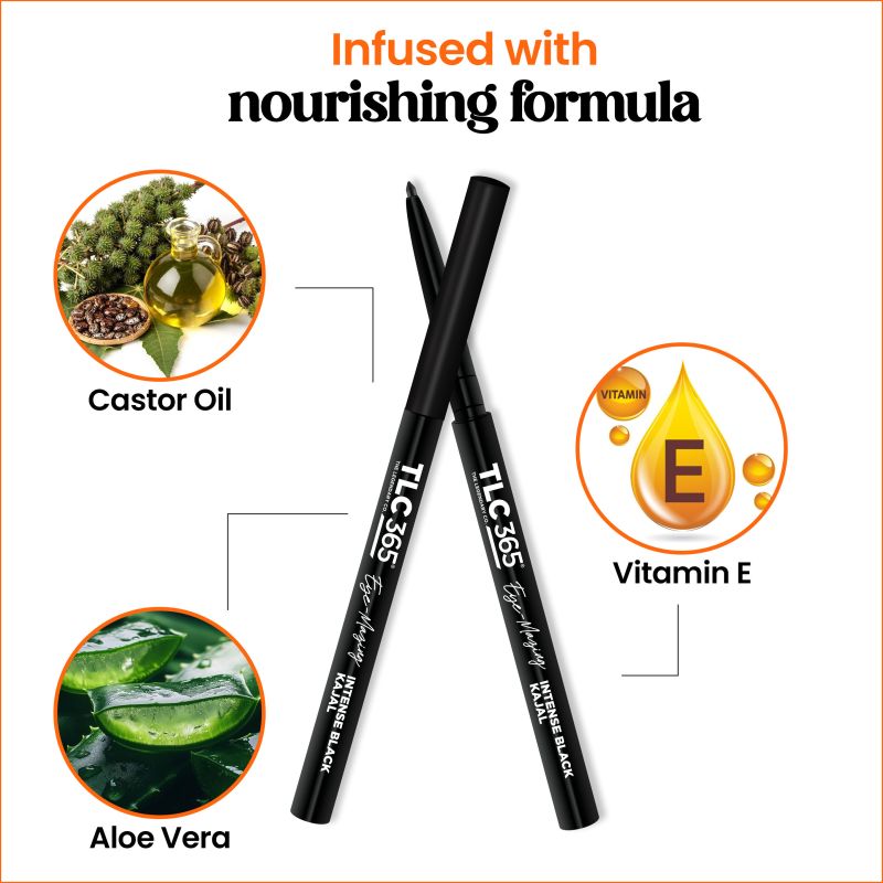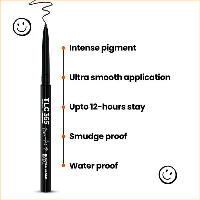 TLC365 Eye-Mazing Intense Black Kajal delivers dark, black colour in just one stroke. Its ultra-pigmented formula gives you bold, dramatic eyes instantly.