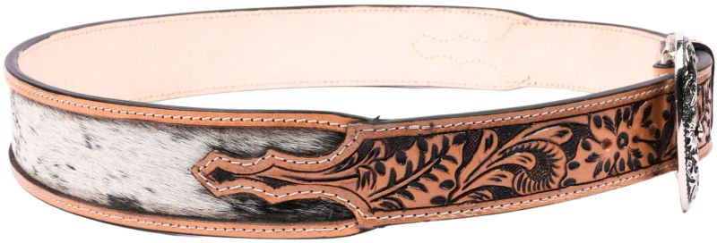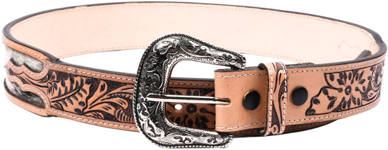 Crafted from Argentina cow leather in a clean natural antique finish, this 40mm tapered belt features a bold white & black Hairon jersey center inlay. With no border and a plain cow grain leather back, its built for minimalist western appealfinished with an engraved nickel buckle.