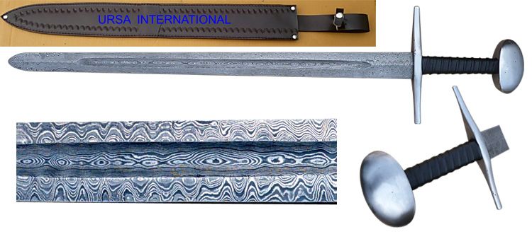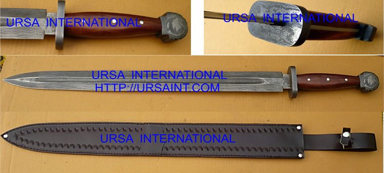 overall length 36 inch Custom Damascus Steel full tang blade, Damascus steel Guard and pommel, Burl Wood handle wrappad Leather.