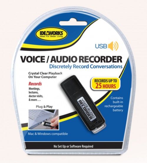 USB VOICEAUDIO RECORDERRecord conversations, doctors visits, meetings, lectures & more. Plays back on any computer. Contains a built in rechargeable batter.User friendly. No set up or software required. ID RET6537BRAND IDW-ETLCASE PACK 48CASE WEIGHT 8.45CASE LENGTH 14.3CASE WIDTH 13.3CONSUMER PACK STANDING CLAMSHELLCONSUMER PACK DIMENSIONS 6.5"X5.5"X1.5"UPC EAN NUMBER 017874009411