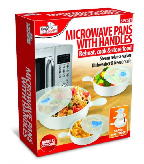 6PC MICROWAVE PANS WHANDLESSet of 3 cooking pots with lids & handles for the microwave. Lids feature adjustable steam pressure release valve for faster cooking. Cook & serve in same pot. Idea for heating up leftovers. Nests for storage. Dishwasher & freezer safe. Bowls: 60o ID JB5329BRAND HGMCASE PACK 12CASE WEIGHT 13.7CASE LENGTH 21.8CASE WIDTH 18.5CONSUMER PACK COLOR BOXCONSUMER PACK DIMENSIONS 8.5 X 3.2 X 10.5UPC EAN NUMBER 017874019380