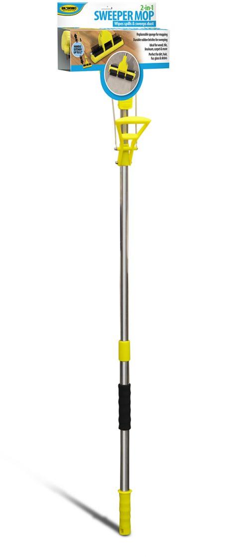 2-IN-1 SWEEPER MOPTelescopic handle extends up to 52-inches. Replaceable sponge for mopping. Durable rubber bristles for sweeping. Ideal for wood, tile, linoleum, carpet & more. Perfect for dirt, hair, fur, glass and debris.ID JB7214BRAND IDW-HNHCASE PACK 6CASE WEIGHT 17.75CASE LENGTH 37.20CASE WIDTH 12.00CONSUMER PACK WRAP AROUND WITH COLOR CARDCONSUMER PACK DIMENSIONS 11" X 6.75" X 36.75" (WPOLE)UPC EAN NUMBER 017874013685
