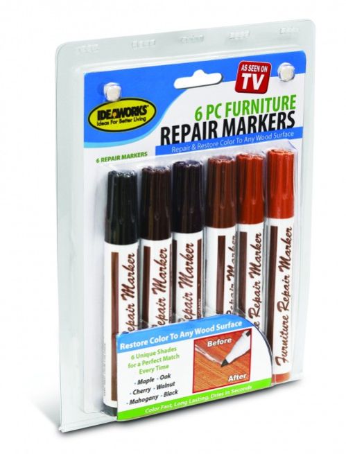 S6 FURNITURE REPAIR MARKERSSet of 6 different shades for major types of wood. Helps restore scratched furniture, cabinets and floors. Hides wood imperfections, nails, holes and scratches. Perfect for vintage furniture. ID RET5343BRAND IDW-HNHCASE PACK 48CASE WEIGHT 17.5CASE LENGTH 14.4CASE WIDTH 13.2CONSUMER PACK CLAMSHELLCONSUMER PACK DIMENSIONS 6.25" X 1.25" X 8.5"UPC EAN NUMBER 017874007554