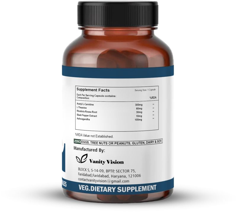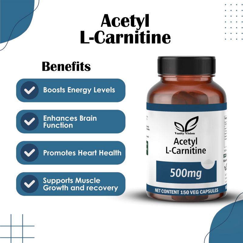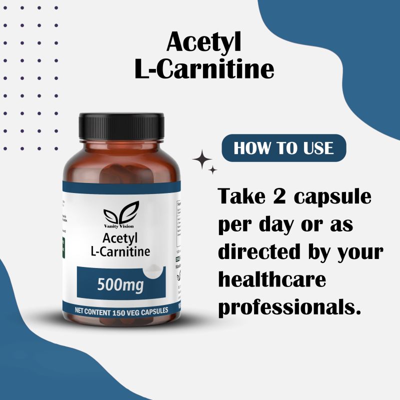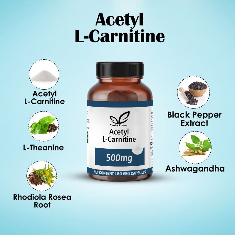 Vanity Vision Acetyl L-Carnitine 500mg is a premium dietary supplement designed to enhance mental clarity, improve energy levels, and support fat metabolism. Acetyl L-Carnitine (ALCAR) is a powerful amino acid derivative that plays a key role in energy production by helping transport fatty acids into the mitochondria, the powerhouses of your cells. This high-quality formula provides 500mg of Acetyl L-Carnitine per capsule, making it easy to incorporate into your daily routine for a natural energy boost and cognitive support.