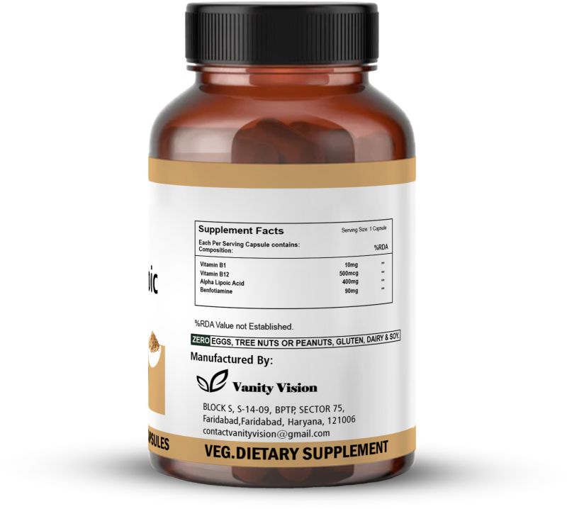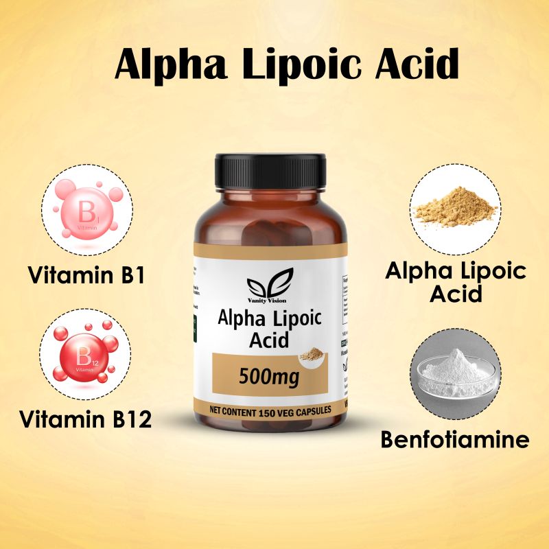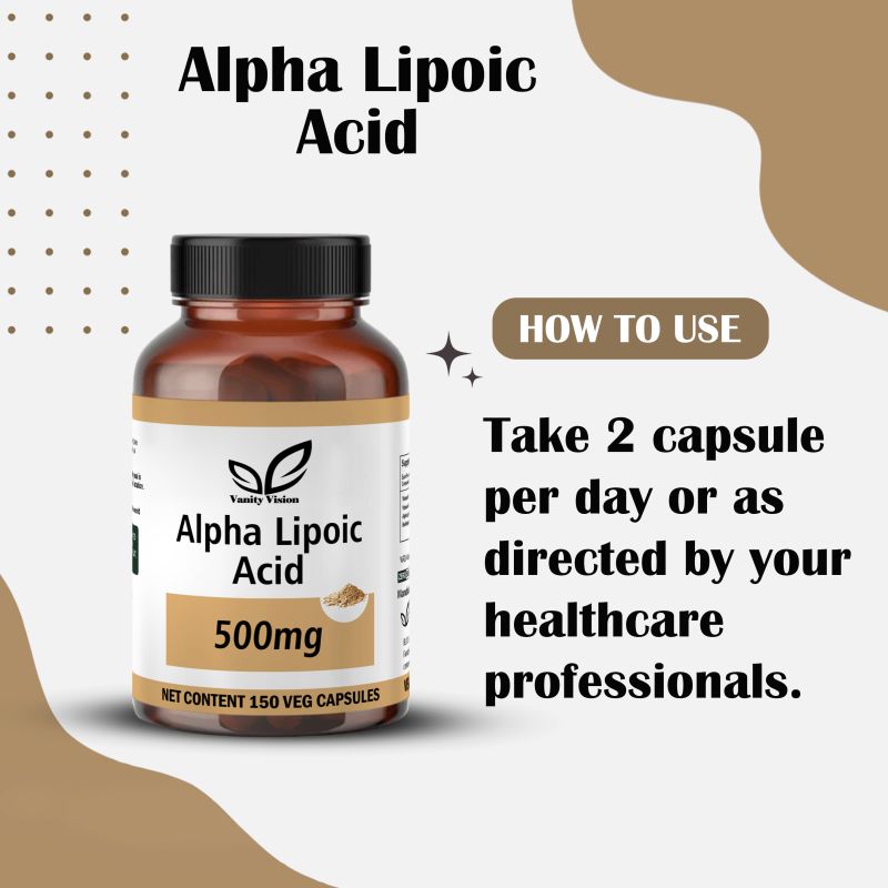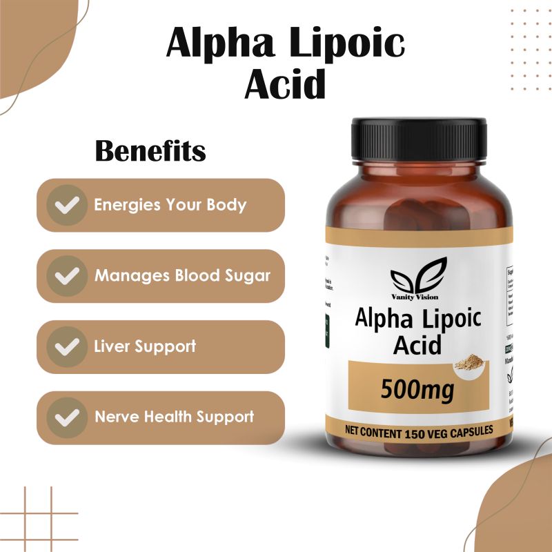 Each capsule contains 500mg of Alpha Lipoic Acid, a convenient way to incorporate this powerful antioxidant into your routine. Vanity Vision Alpha Lipoic Acid Capsules are vegan, gluten-free, and non-GMO, offering a high-quality supplement for individuals with specific dietary needs.