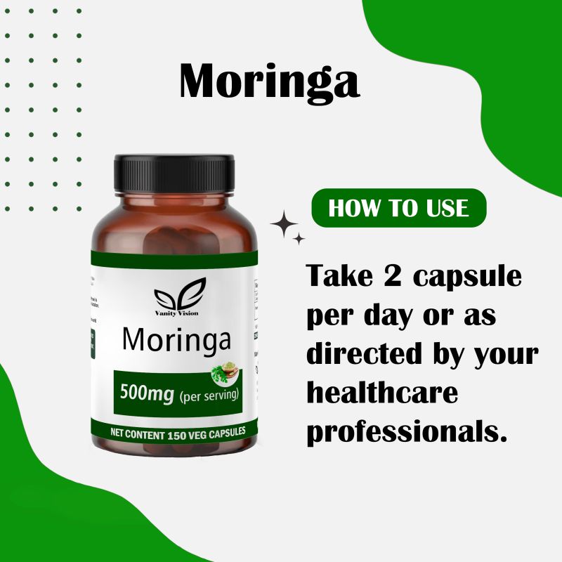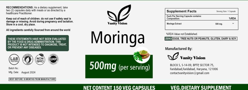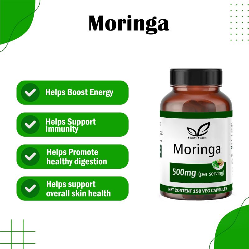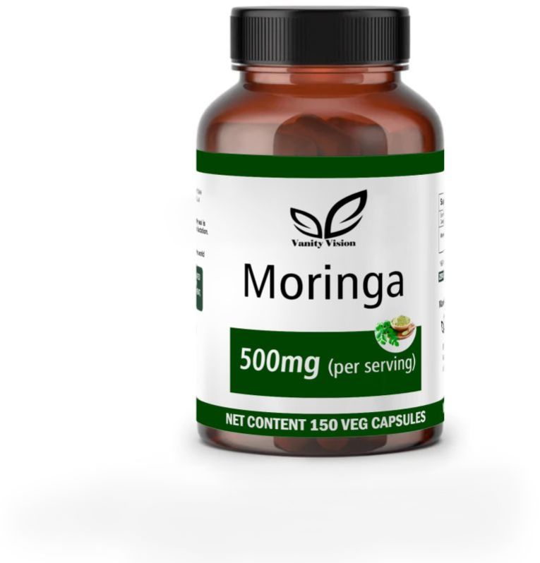 Vanity Vision Moringa 500mg, a premium dietary supplement designed to support overall health and wellness. Derived from the leaves of the Moringa Oleifera tree, often referred to as the "Miracle Tree, " this supplement provides a potent dose of nutrients in each capsule to help nourish and energize your body.