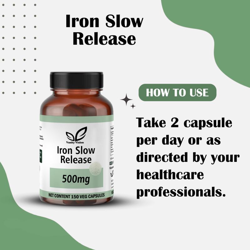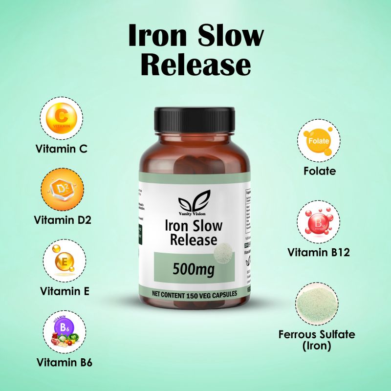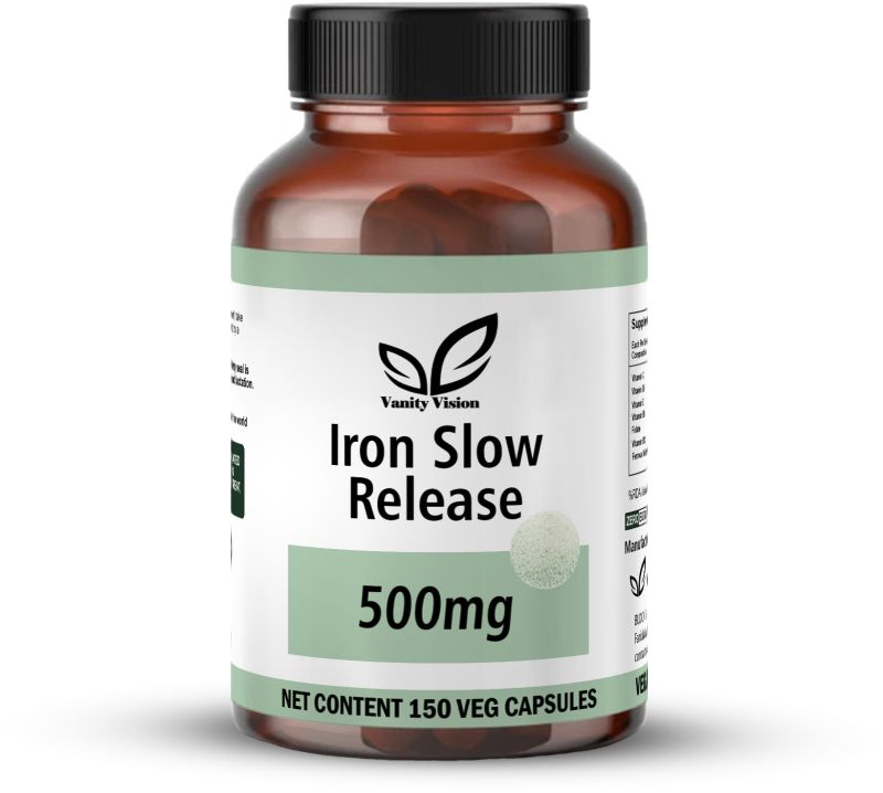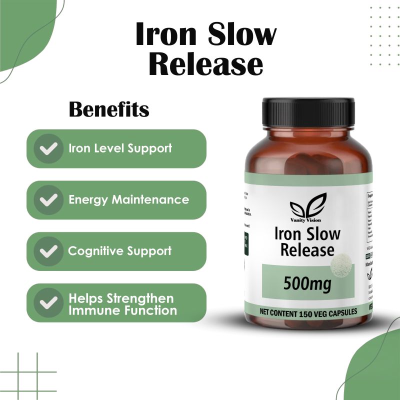 Promotes Energy and Reduces Fatigue: Iron plays a significant role in oxygenating muscles and tissues, helping reduce fatigue and maintain energy levels. Vanity Vision Iron Slow Release 500mg Capsules help ensure the body stays energized, preventing feelings of tiredness that can result from low iron.