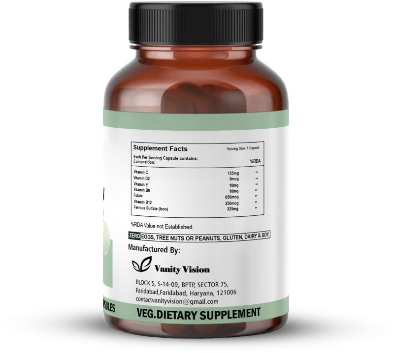 Helps with Iron Deficiency Anemia: Iron-deficiency anemia can cause symptoms such as pale skin, dizziness, and shortness of breath. Regular use of Vanity Vision Iron Slow Release Capsules can help restore iron levels, helping prevent or treat anemia and improving overall well-being.
