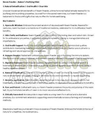 Purify your body naturally with 100% pure Neem Powder. Supports gut health, detoxifies the blood, and promotes clear skin. A must-have Ayurvedic herb for internal cleansing and immunity support!