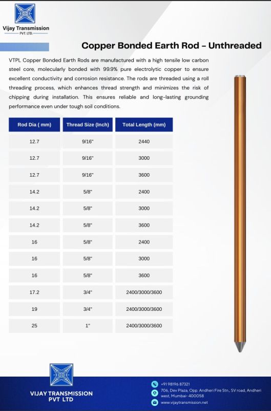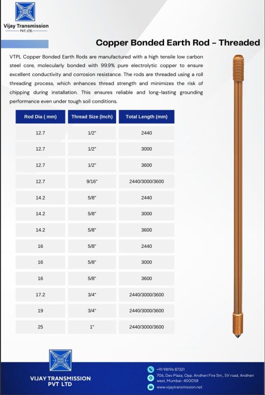 VTPL Copper Bonded Earth Rods are manufactured with a high tensile low carbon steel core, molecularly bonded with 99.9% pure electrolytic copper to ensure excellent conductivity and corrosion resistance. The rods are threaded using a roll threading process, which enhances thread strength and minimizes the risk of chipping during installation. This ensures reliable and long-lasting grounding performance even under tough soil conditions.