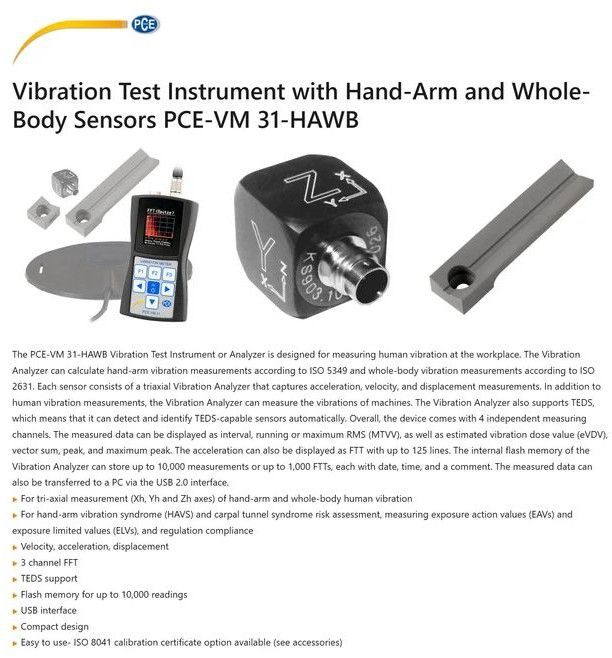 The PCE-VM 31-HAWB Condition Monitoring Human Vibration Meter is designed for measuring human vibration at the workplace. The Condition Monitoring Vibration Meter can calculate hand-arm vibration measurements according to ISO 5349 and whole-body vibration measurements according to ISO 2631. Each sensor consists of a triaxial vibration meter that captures acceleration, velocity, and displacement measurements.