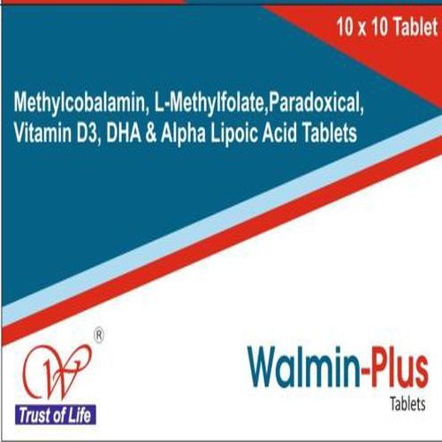 Walmin Plus Tablet is a combination of Mecobalamin, L-Methylfolate, Pyridoxal-5-Phosphate, Alpha Lipoic Acid, Vitamin D3, and DHA. It is used in the treatment of nutritional deficiencies. It supports growth and development, replenishes essential nutrients, aids in red blood cell production, promotes cellular, nerve, and brain function, and helps maintain a healthy immune system.