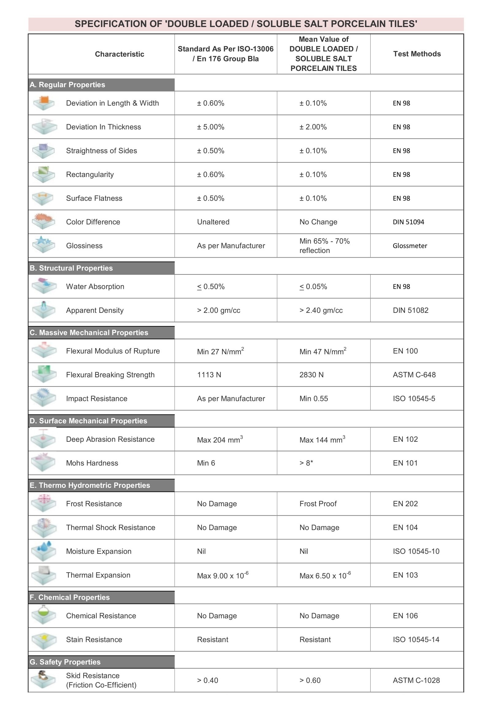 | Flexural Modulus of rupture | Min 35 N/MM2 | Min 40N/MM2 | ISO 10545-4 |