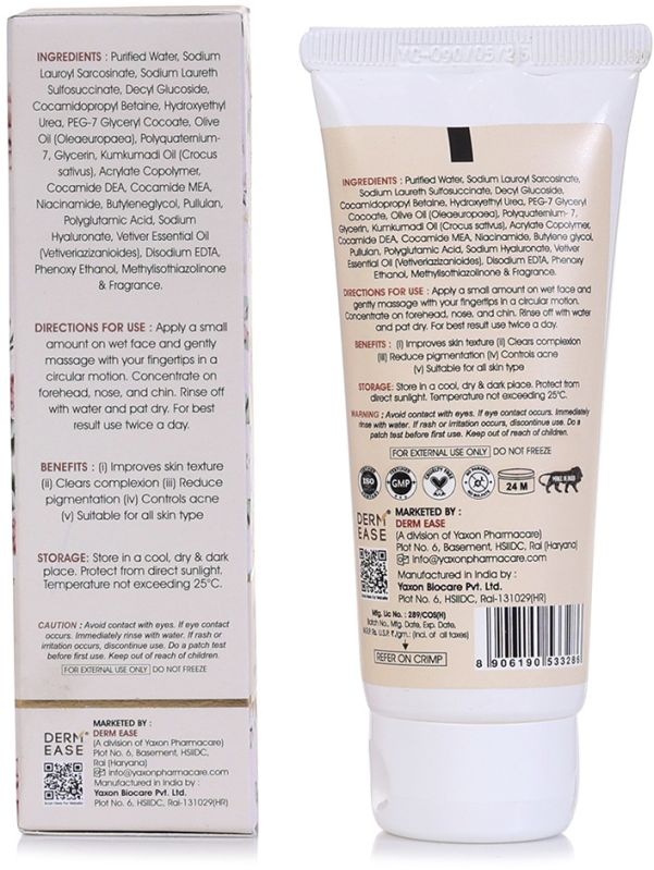 DERM EASE Ubtan Face Wash It is a brightening, softening and smoothing face wash based on the traditional ubtan recipes with chickpea flour, almond powder, saffron, turmeric, rosewater and sandalwood oil.