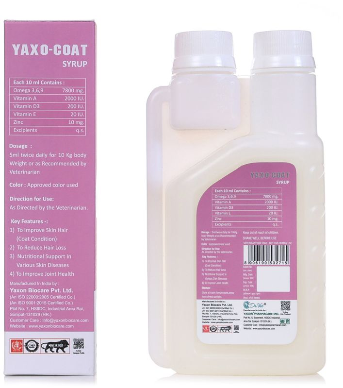 Yaxocoat Syrup is easy to administer, highly palatable, and ideal for daily use in dogs, cats, and other domestic animals, especially those suffering from dull coat, dry or itchy skin, shedding, or dermatological conditions caused by nutritional deficiencies.