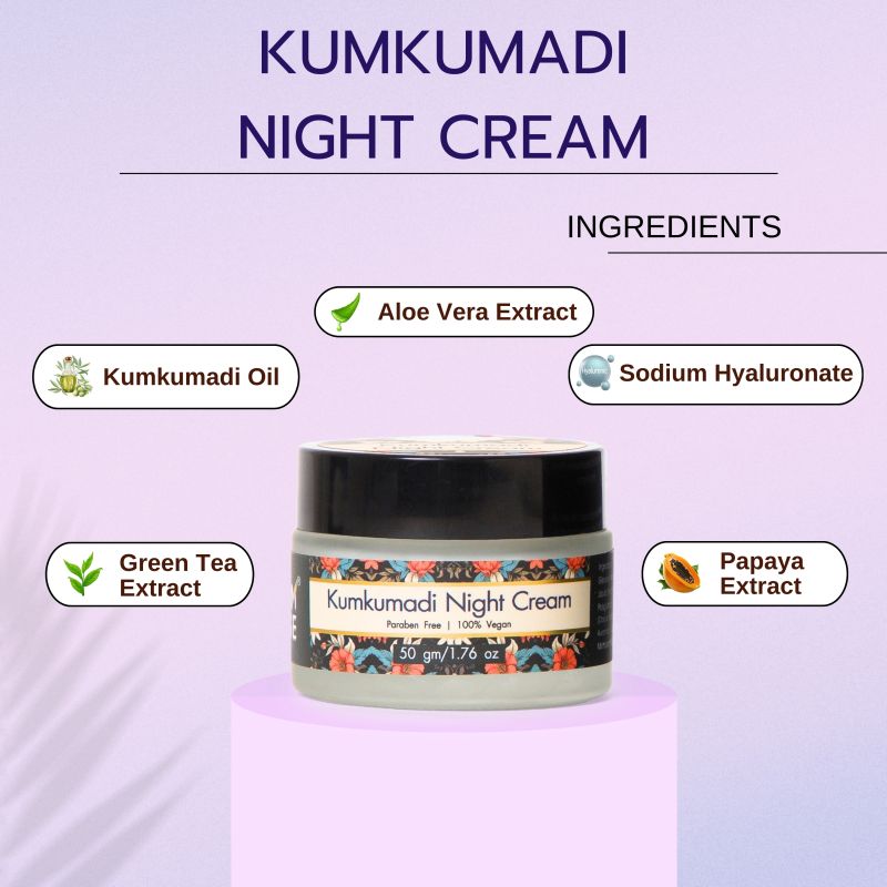 Experience deep overnight skin rejuvenation with Kumkumadi Night Cream, an advanced skincare formula enriched with traditional Ayurvedic wisdom and modern skin science. This luxurious cream have blends of Kumkumadi Oil, Aloe Vera, Papaya, and Green Tea Extracts with scientifically backed hydrators like Hyaluronic Acid and Polyglutamic Acid. Designed to nourish, repair and brighten your skin while you sleep, it leaves your complexion softer, smoother, and naturally radiant by morning.