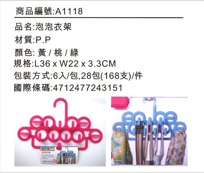 Hanger a1118 designing to hang briefcases, backpacks and so on! product information: material:p.p color:yellow, green, peach 6pcebag, 28 bagspkg(168 pce) price:usd1.5piece min.order:19pkg(3192 pieces, 1*6*28*19) ying tai plastic(tainan, taiwan) 1. Professional manufacturer _ has specialized in producing plastic products since 1970. 2 services for demands_ offer ing o.e.m and o.d.m service. Senior mechanics and well efficiency-facilities. 3.many kinds of products for selections- houseware, kitchenware, stationery, storaged, and other plastic products are involved in our line. Your demands are what we offered, ying tai always efforts for you!