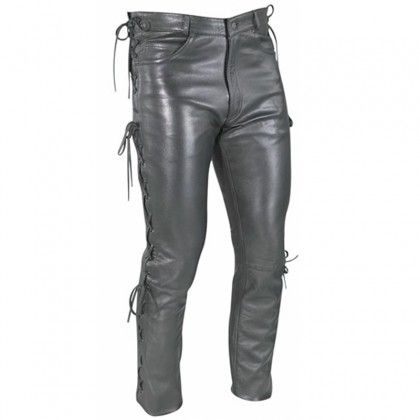We are offering jean leather laces pant, , full black leather, both side laces, made by genuine cowhide mild leather, front at two hands pockets both side and key small pocket, front at waist belt button closure, front at fly zipper closure.Genuine cowhide mild leather1.2-1.3 mm